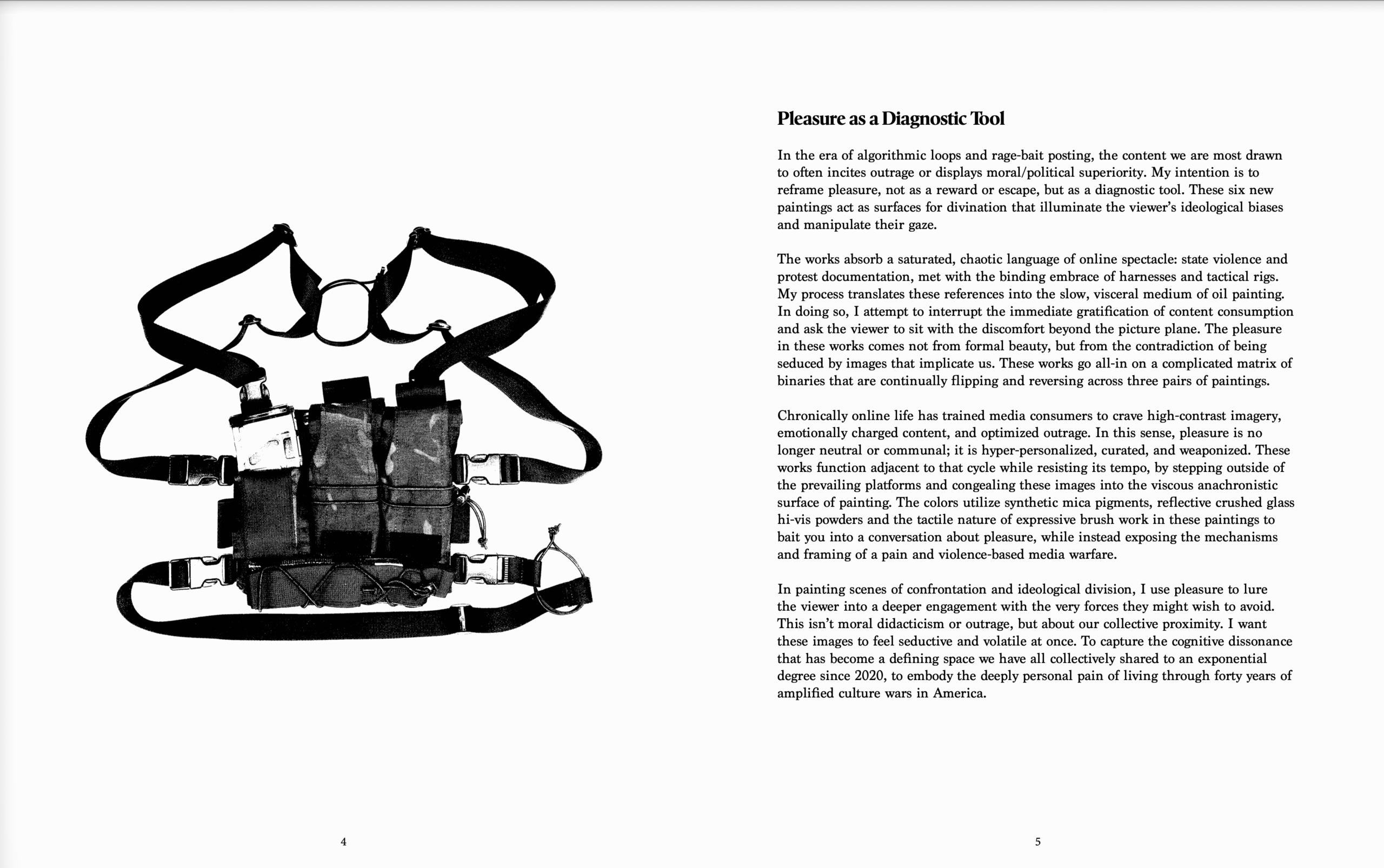 10″ x 8″ exhibition catalog for Glancing, Gutted. This book is printed in full color, 48 pages 100lb text stock, 130lb cover stock with matte UV finish. Limited edition of 125. Book includes: artist essay, install shots, pairings of paintings, details, process and portrait shots.